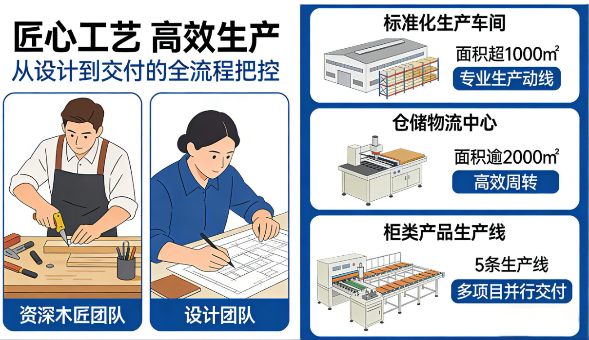 公司拥有经验丰富的资深木匠团队与创新务实的设计团队,从图纸深化到工艺实现,全程把控产品细节与美学体验。两大标准化生产车间,面积均超1000平方米,配备专业生产动线;仓储物流中心逾2000平方米,支持规模化订单的高效周转。公司最大可同步运作5条柜类产品生产线,具备稳定的多项目并行交付能力。
